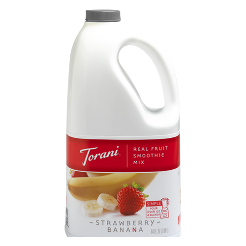 A childhood favorite, Torani Strawberry Banana Real Fruit Smoothie Mix blends a creamy banana base with juicy strawberries for a perfect contrast. Now in an all-natural formula with no preservatives, no artificial colors, no artificial flavoring, no caffeine, no fat, and no dairy, Torani smoothie mixes offer a fresh, real fruit taste in a easy to use pour-and-blend format.