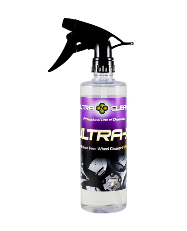 ULTRA-X is a specially formulated wheel cleaner designed to remove iron and metal particles from any type of wheel. It can be used to remove oxidation on chrome, painted surfaces and glass surfaces