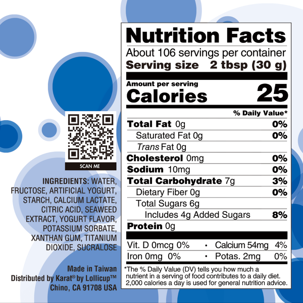 Water, Fructose, Artificial Yogurt, Starch, Calcium Lactate, Seaweed Extract, Flavor, Malic Acid, Potassium Sorbate